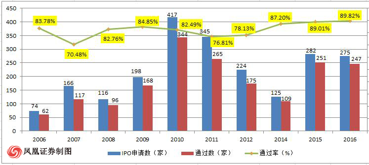 記者統(tǒng)計了近十年以來的IPO數(shù)據(jù),盡管十年間新股發(fā)行共經(jīng)歷5次暫停(分別為2005.5-2006.6、2008.9-2009.6、2012.10-2014.1、2014.1-2014.6、2015.6-2015.12),但是整體上看新股發(fā)行的通過率呈現(xiàn)波動式上升的趨勢。其中,從2011年以來,新股發(fā)行的通過率實現(xiàn)逐年連升,2016年更是創(chuàng)下近十年新高的89.82%的整體通過率。