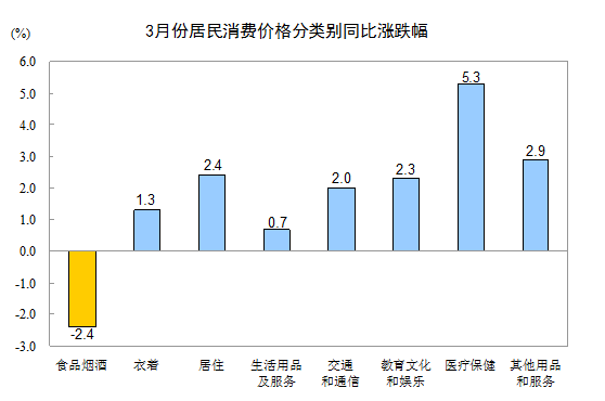 3 月份,其他七大類價(jià)格同比均有所上漲。其中,醫(yī)療保健、其他用品和服務(wù)、居住、教育文化和娛樂、交通和通信、衣著、生活用品及服務(wù)價(jià)格分別上漲 5.3% 、 2.9% 、 2.4% 、 2.3% 、 2.0% 、 1.3% 和 0.7% 。