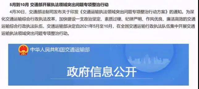 4月30日,交通運(yùn)輸部印發(fā)了《交通運(yùn)輸執(zhí)法領(lǐng)域突出問題專項(xiàng)整治行動(dòng)方案》,決定自今年5月至10月開展專項(xiàng)整治行動(dòng)。