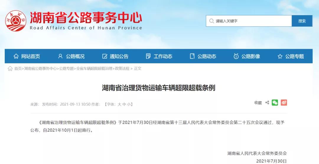 10月1日起,《湖南省治理貨物運(yùn)輸車輛超限超載條例》正式施行?!稐l例》在貨物運(yùn)輸車輛源頭管控、通行監(jiān)管、法律責(zé)任等方面都作了具體規(guī)定。