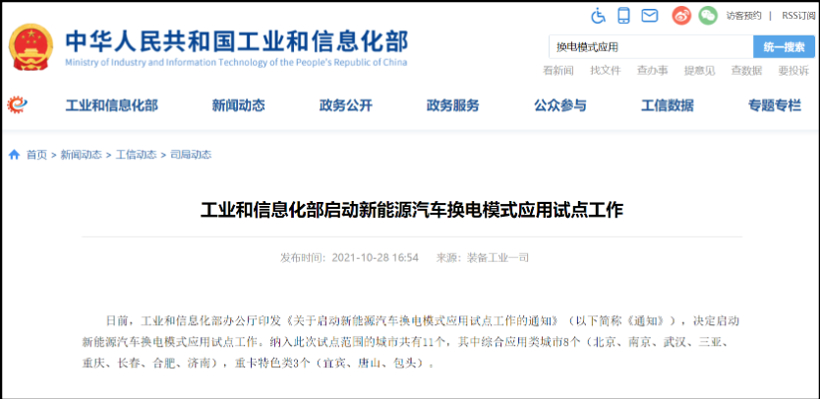 10月28日,工業(yè)和信息化部辦公廳印發(fā)《關(guān)于啟動(dòng)新能源汽車換電模式應(yīng)用試點(diǎn)工作的通知》,決定啟動(dòng)新能源汽車換電模式應(yīng)用試點(diǎn)工作。納入此次試點(diǎn)范圍的城市共有11個(gè),其中綜合應(yīng)用類城市8個(gè)(北京、南京、武漢、三亞、重慶、長春、合肥、濟(jì)南),重卡特色類城市有3個(gè)(宜賓、唐山、包頭)。